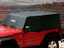 Black water-resistant nylon Cab Cover with Jeep logo. Folds into a snap-closure storage bag (included).